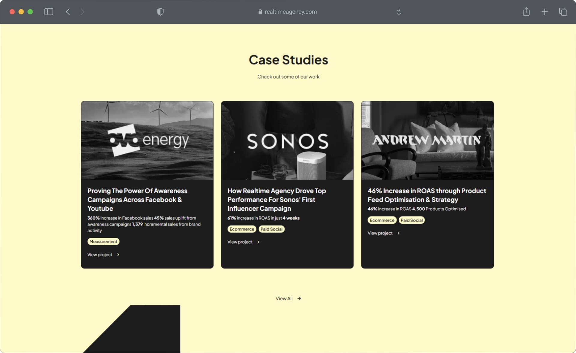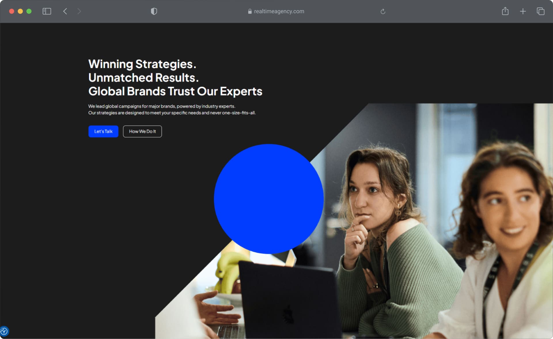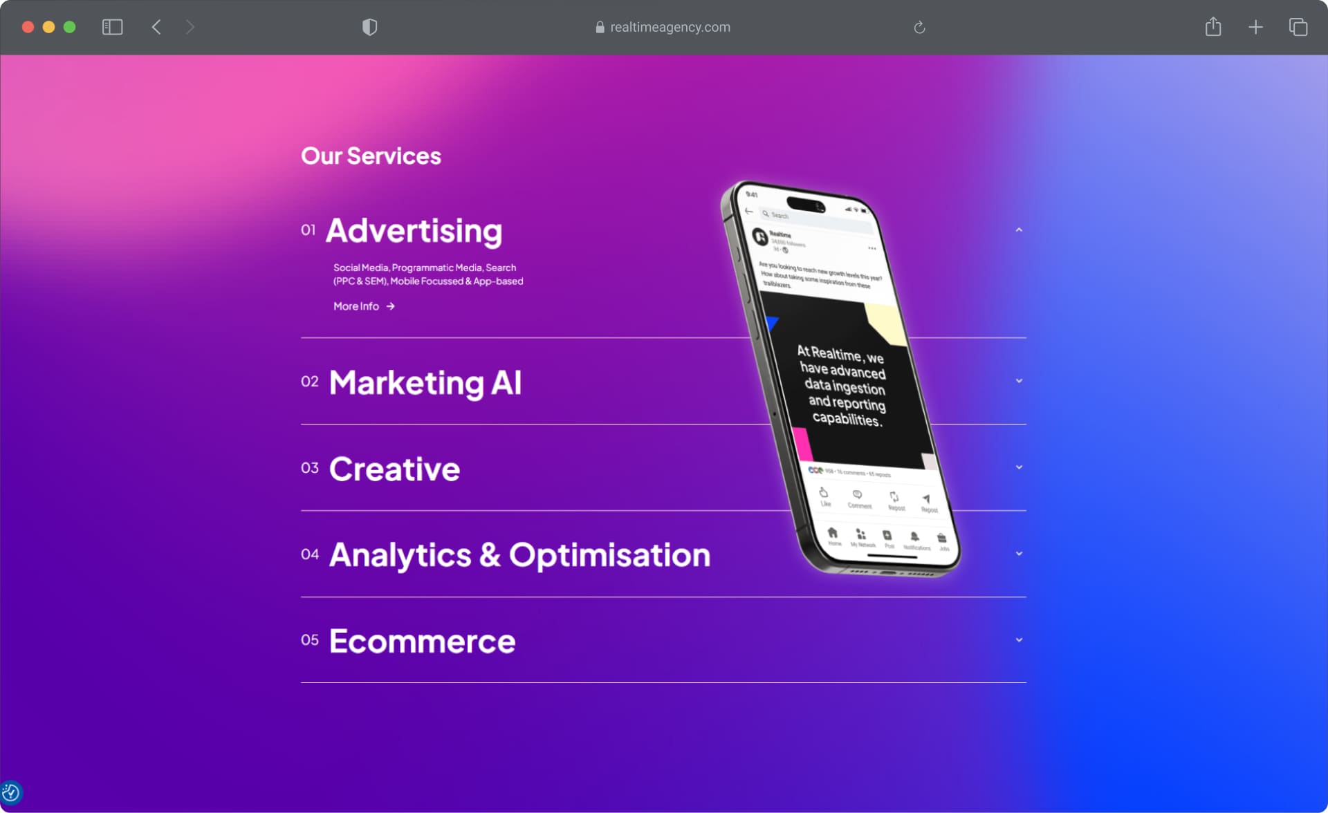 The redesigned website for Realtime successfully addressed the company’s challenges and exceeded expectations. It provided a modern, user-friendly platform that effectively showcased Realtime’s expertise across various service areas, improved user engagement, and facilitated seamless client interactions. The strategic approach and collaboration with Realtime ensured a successful digital transformation, allowing them to reach a wider audience and enhance their overall impact. The new website serves as a powerful tool for Realtime, enhancing their online presence and solidifying their position as a leading digital agency.