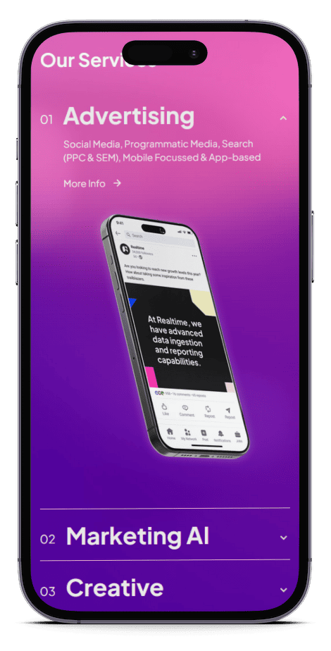 Realtime is a leading digital agency that offers comprehensive services across various niches, including Advertising, Marketing AI, Creative, Analytics & Optimization, and Ecommerce. Their mission is to help businesses achieve their goals through innovative digital solutions and strategic insights.